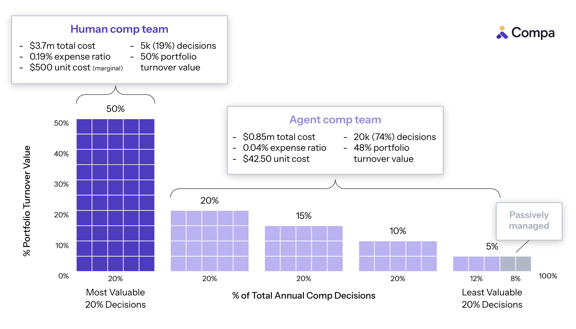 Supporting comp decisions with AI agents is 90% lower cost than humans. That, in turn, unlocks new levels of coverage and precision to manage billions in pay each year.
