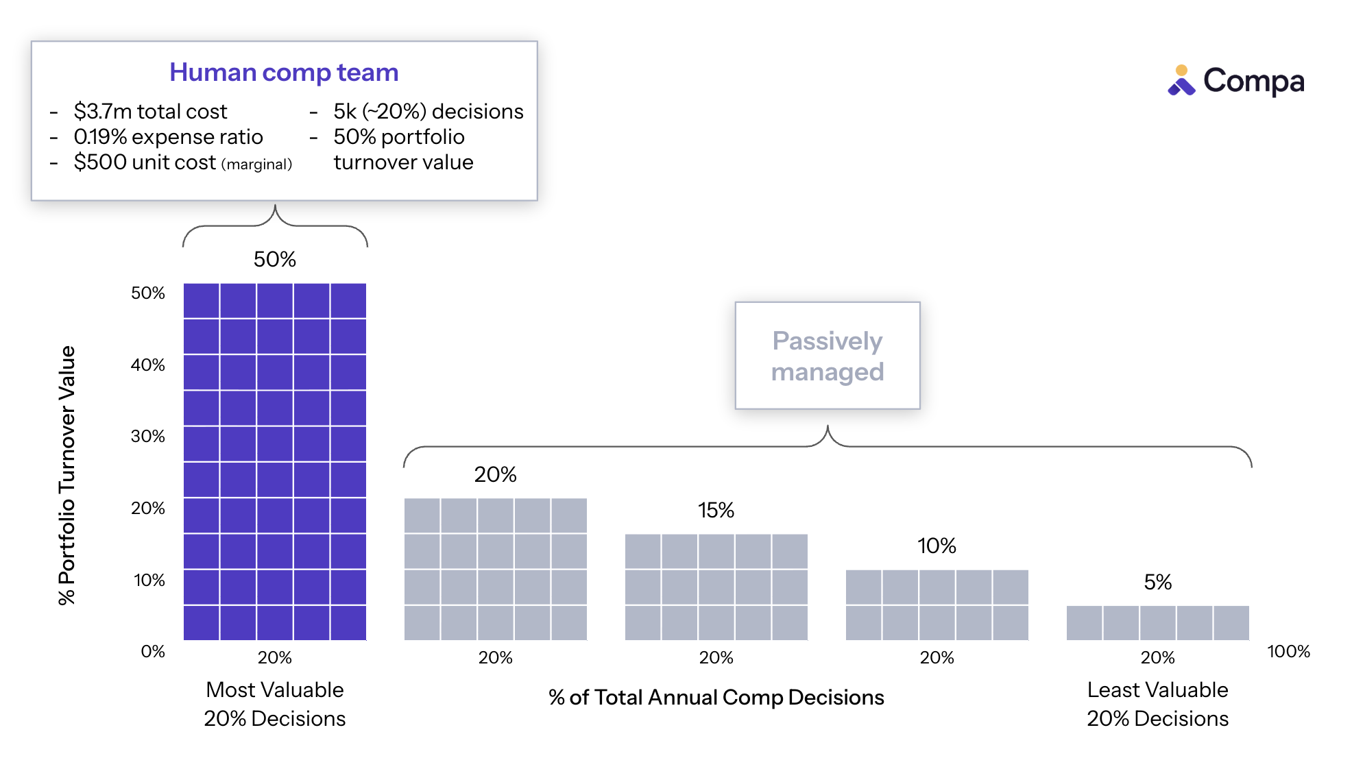 Most comp teams rationally triage a small percentage of high-value decisions and passively managing the rest, resulting in a lower-than-expected expense ratio