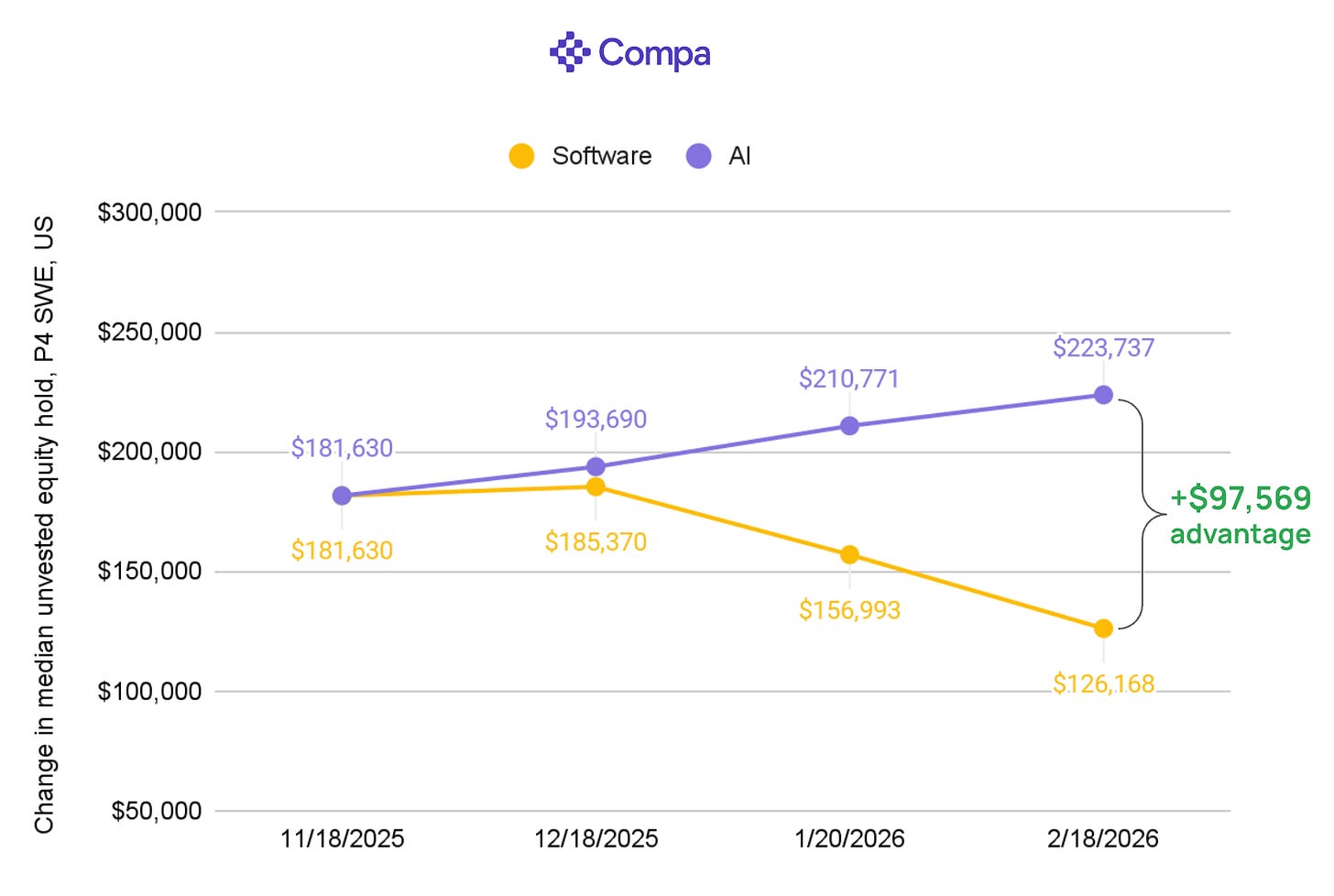 All else equal, this engineer’s unvested equity hold dropped on average to $126,128 at software companies and grew to $223,737 at the AI companies.
