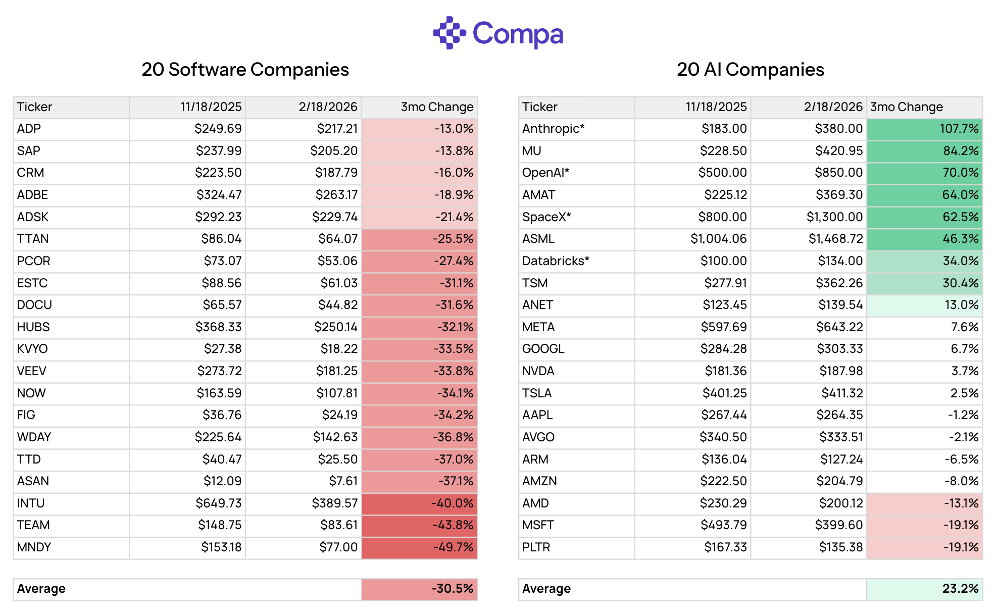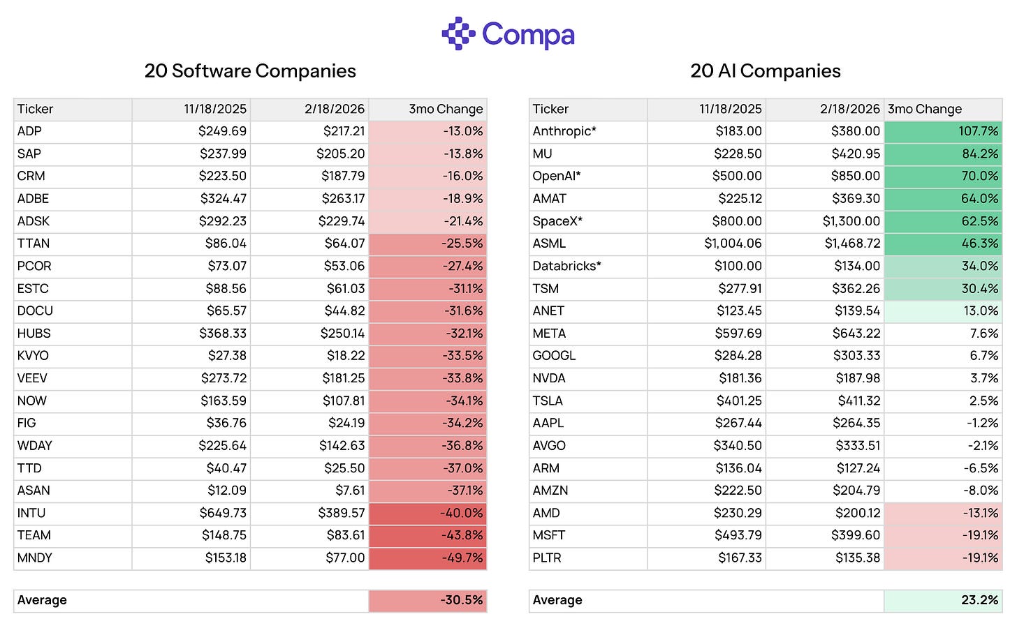 Let’s take a basket of 20 software companies and 20 AI companies and look at how their stock prices changed over a three-month period from November 18, 2025, to this week closing February 18, 2026.